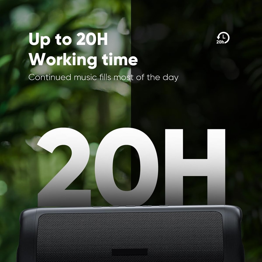BoomyVora fully charges in approximately 3-4 hours using the included Type-C cable. A full charge provides up to 20 hours of playback at moderate volume levels.