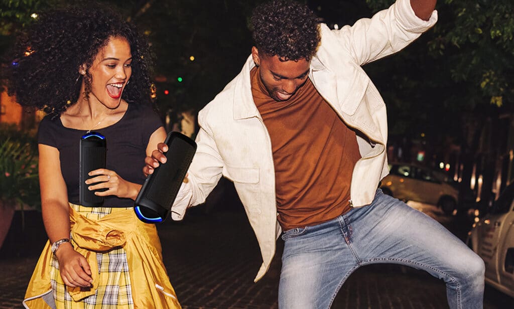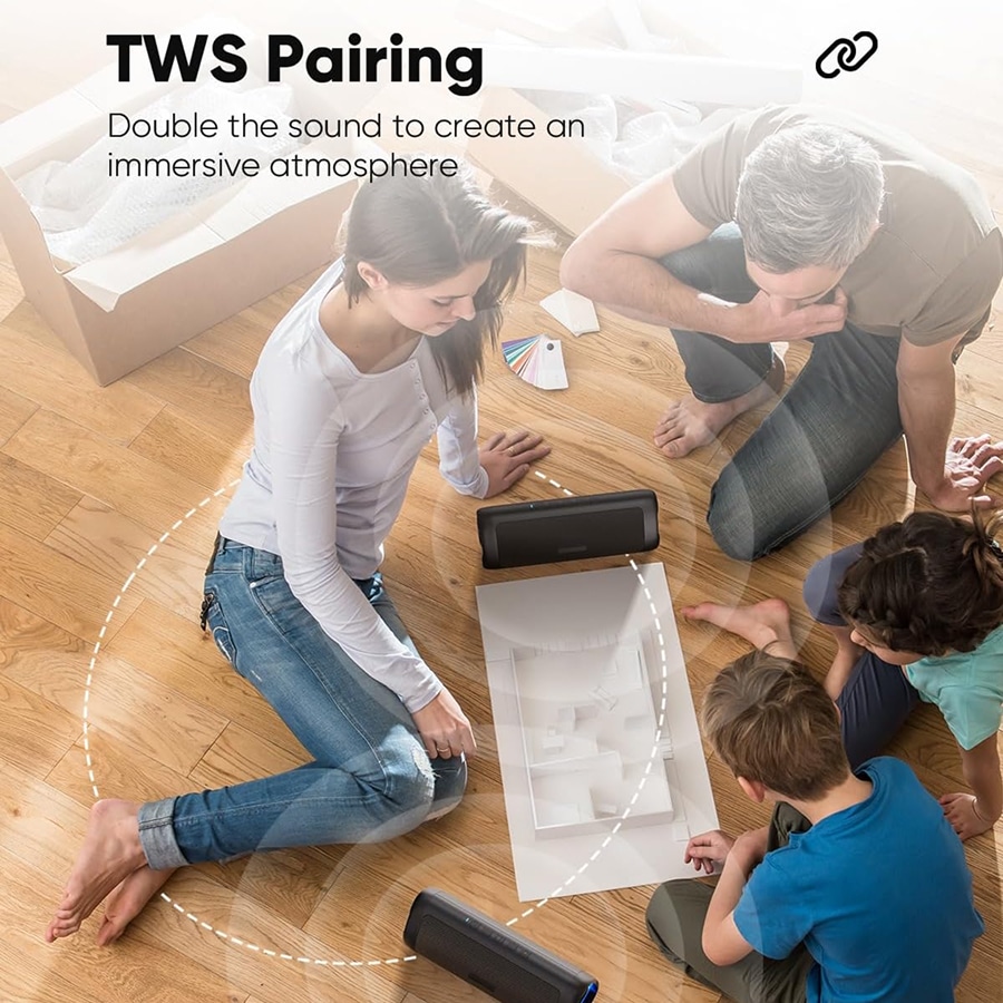 Enable Bluetooth on your device, connect to the first BoomyVora, then press the TWS button. Power on the second speaker to automatically pair for stereo output.