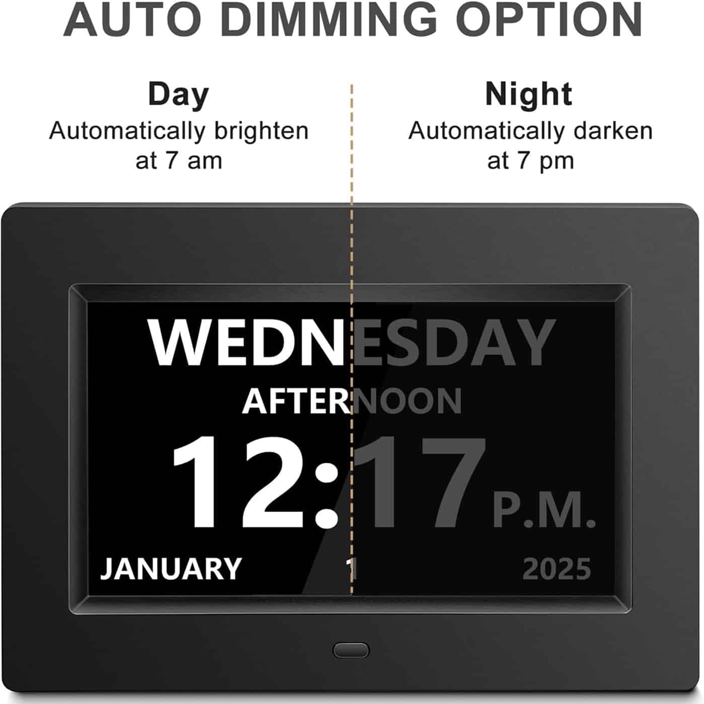 Yes, the Calenvex features automatic brightness adjustment that adapts to room lighting conditions, ensuring comfortable viewing day and night without manual intervention or eye strain.