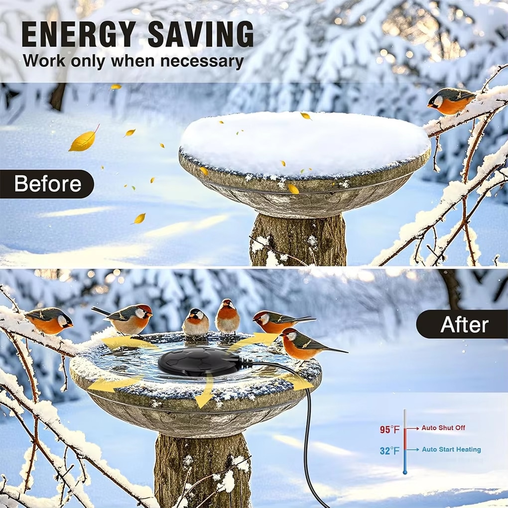 Yes, CozyeeVyx works safely with plastic, ceramic, and metal bird baths. The thermostat-controlled temperature prevents overheating that could damage any bath material you're using.