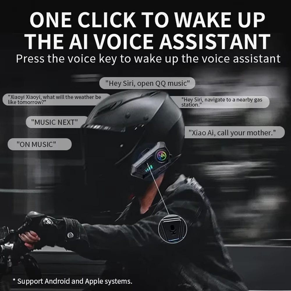 The AI voice assistant feature works seamlessly with both Android and Apple devices. Simply activate your phone's native voice assistant to control music, calls, navigation, and weather updates through completely hands-free voice commands whilst riding.
