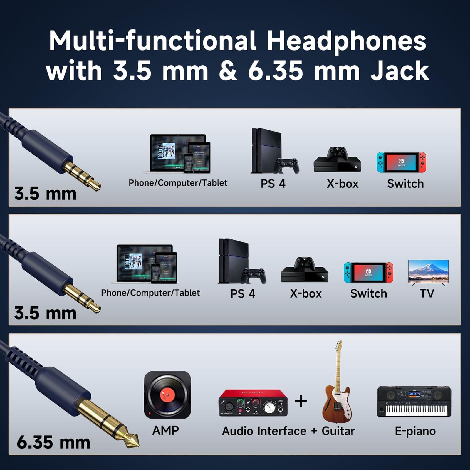 The 6.35mm plug connects to professional equipment whilst the 3.5mm plug works with consumer devices like phones and laptops.
