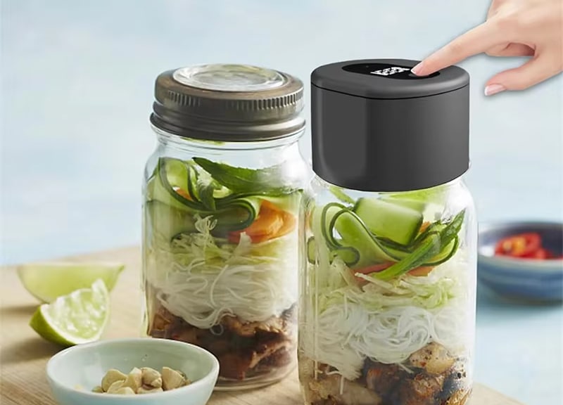 The LockNJar extends food freshness up to five times longer than traditional storage methods by creating a complete vacuum seal that prevents oxidation and bacterial growth, keeping produce, herbs, and dry goods fresh for weeks.