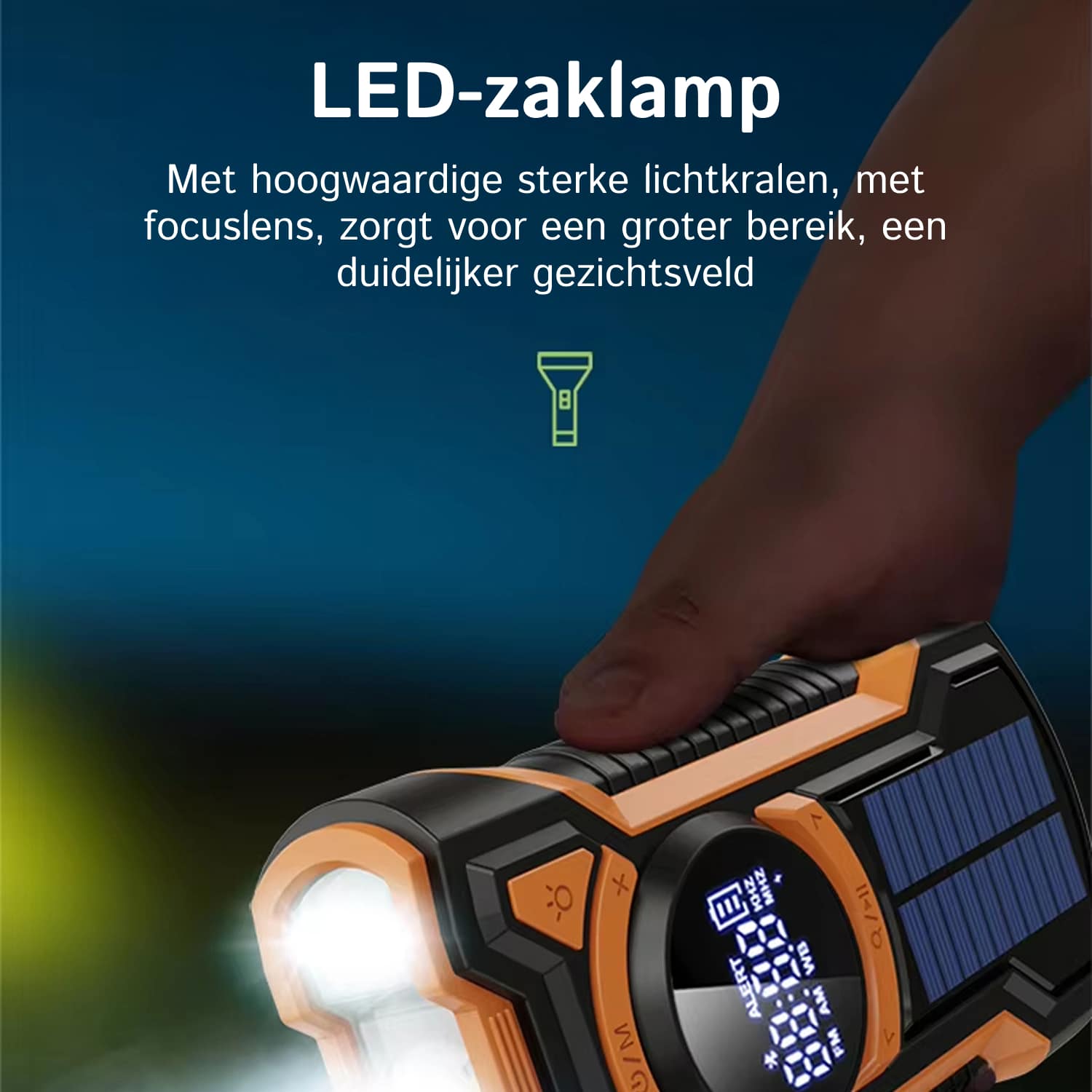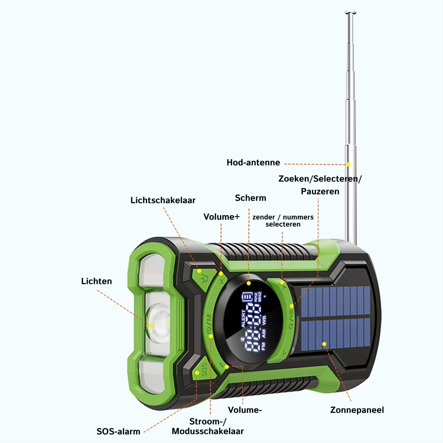 Dient als radio, zaklamp, powerbank en noodsignaalgever. Eén apparaat dat multiple functies combineert, perfect voor dagelijks gebruik, outdoor activiteiten en noodgevallen.