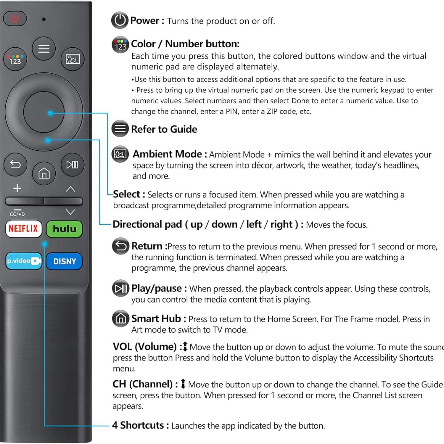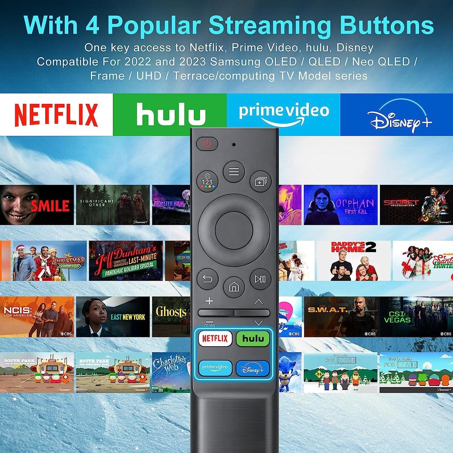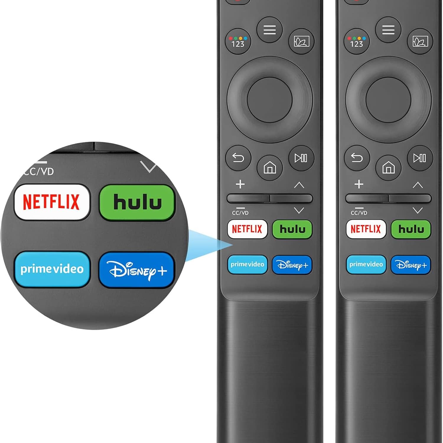 Streaming buttons require your Samsung TV to support these apps. If a button doesn't respond, your TV model may not have that app pre-installed or available.